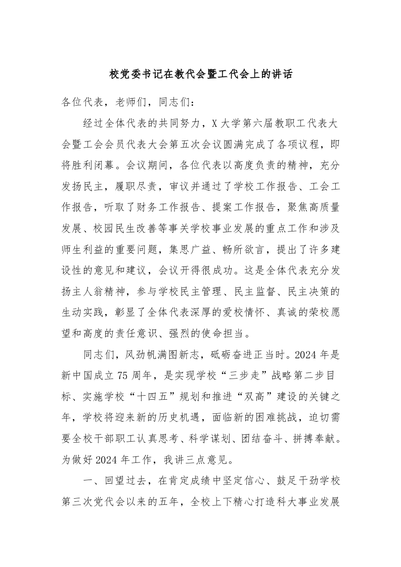 / 校党委书记在教代会暨工代会上的讲话