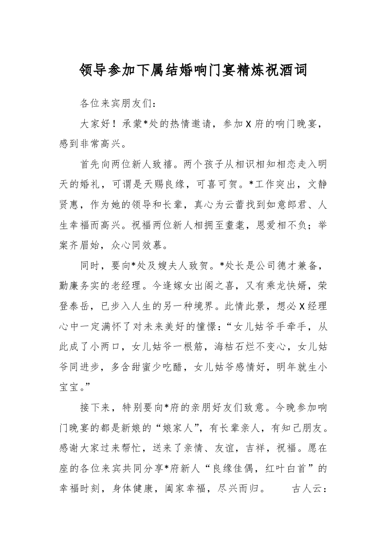 / 领导参加下属结婚响门宴精炼祝酒词