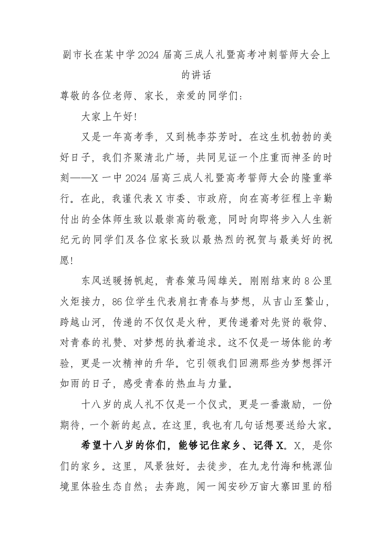 / 副市长在某中学2024届高三成人礼暨高考冲刺誓师大会上的讲话