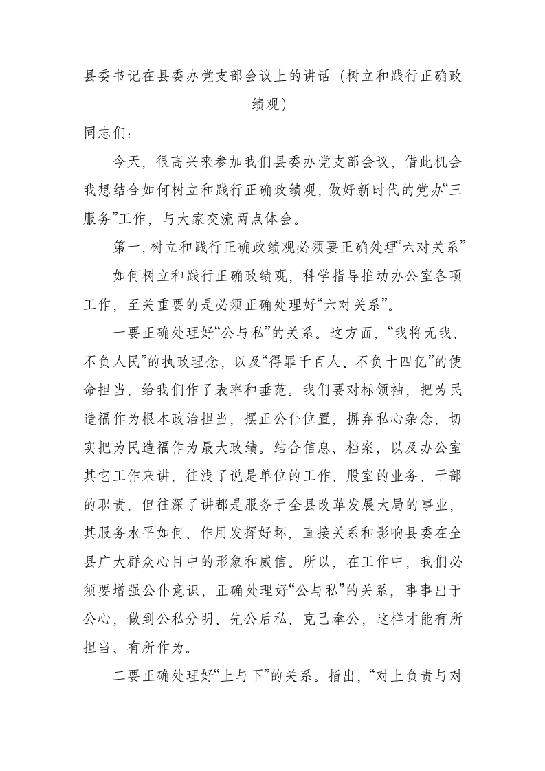 / 县委书记在县委办党支部会议上的讲话(树立和践行正确政绩观)