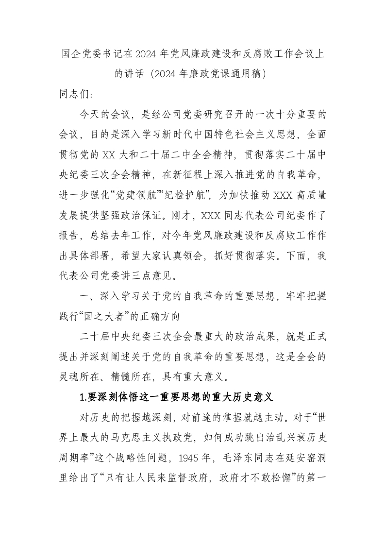 / 国企党委书记在2024年党风廉政建设和反腐败工作会议上的讲话(2024年廉政党课通用稿)