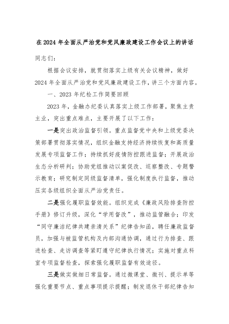 / 在2024年全面从严治党和党风廉政建设工作会议上的讲话
