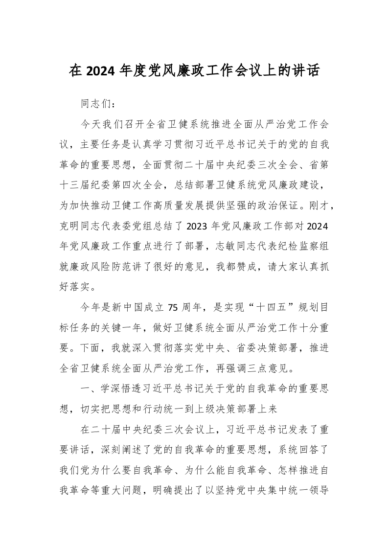 在2024年度卫健系统党风廉政工作会议上的讲话