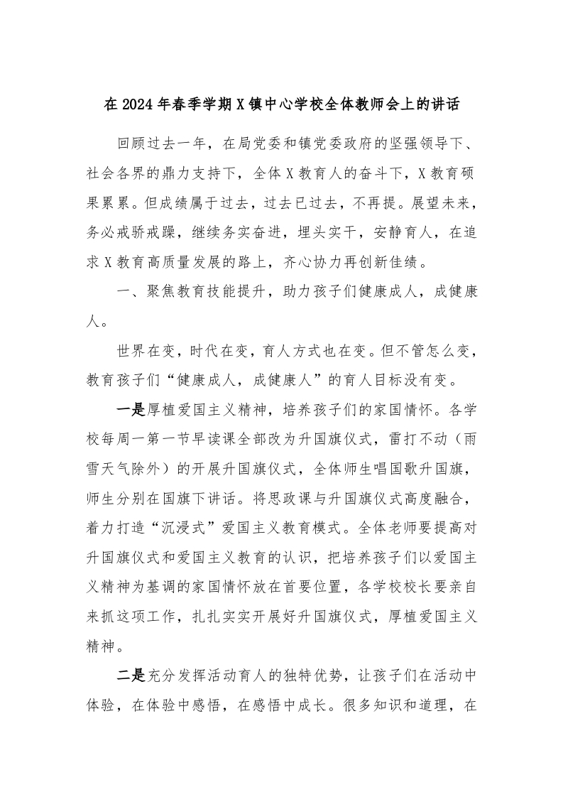 / 在2024年春季学期X镇中心学校全体教师会上的讲话