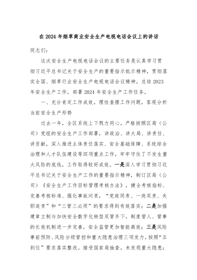 / 在2024年烟草商业安全生产电视电话会议上的讲话