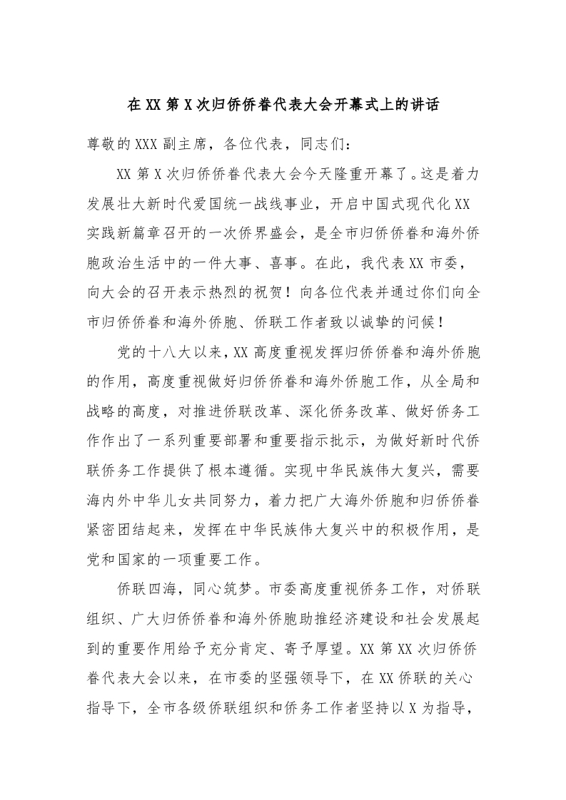 / 在XX第X次归侨侨眷代表大会开幕式上的讲话