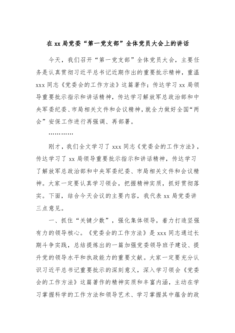 / 在xx局党委“第一党支部”全体党员大会上的讲话