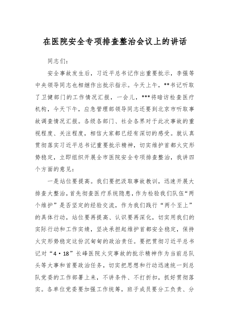 / 在医院安全专项排查整治会议上的讲话
