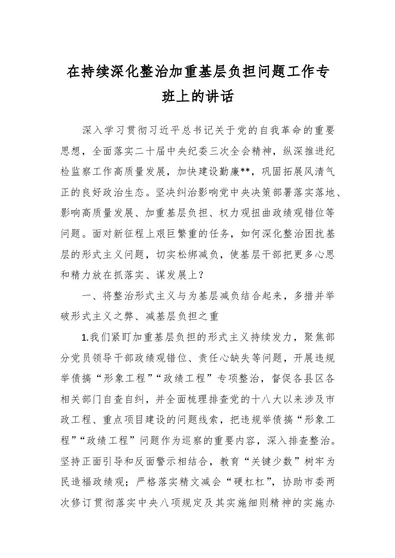 / 在持续深化整治加重基层负担问题工作专班上的讲话