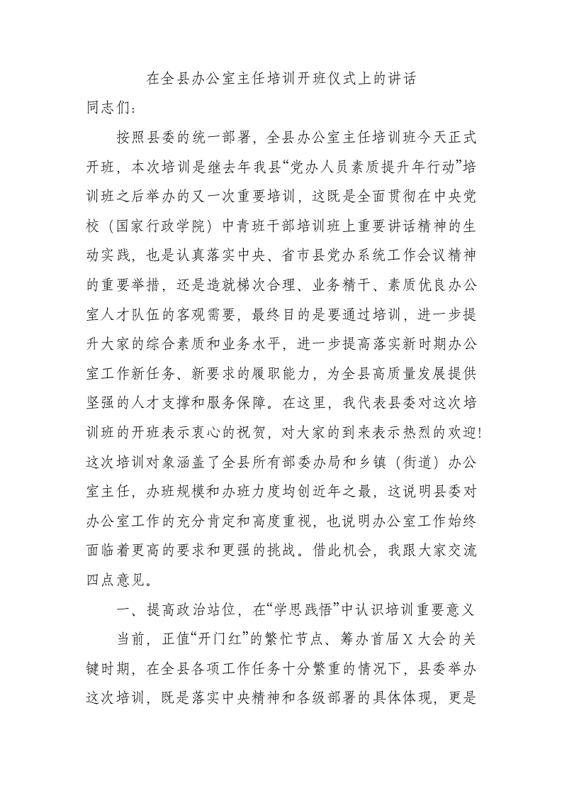 / 在全县办公室主任培训开班仪式上的讲话