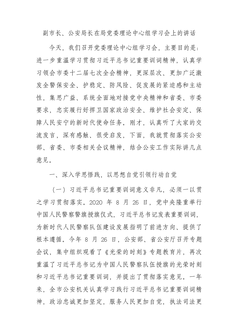 副市长、公安局长在中心组学习会上的讲话(训词精神)