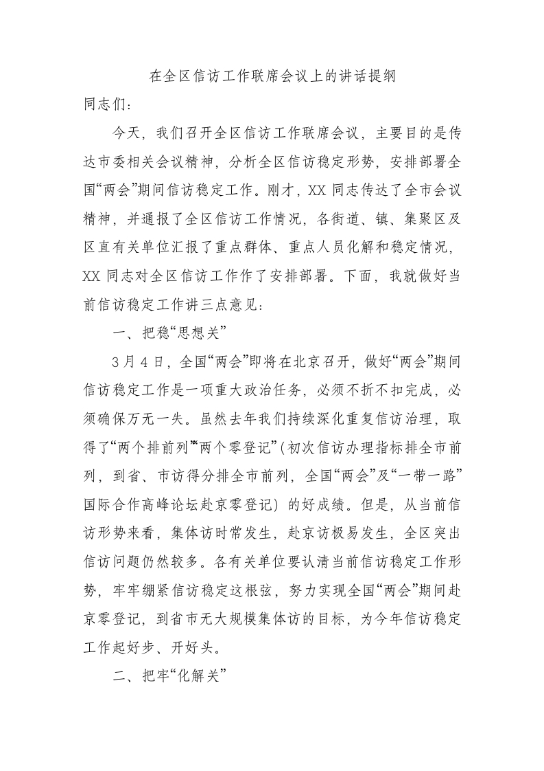 / 在全区信访工作联席会议上的讲话提纲