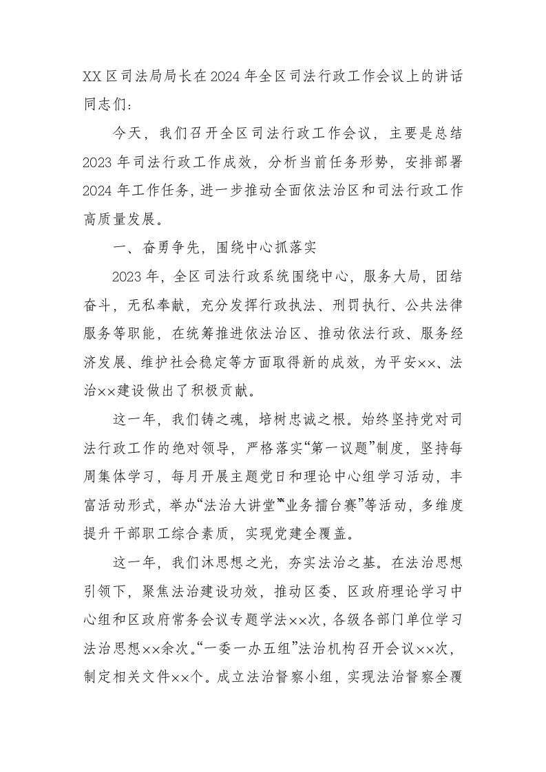 / XX区司法局局长在2024年全区司法行政工作会议上的讲话