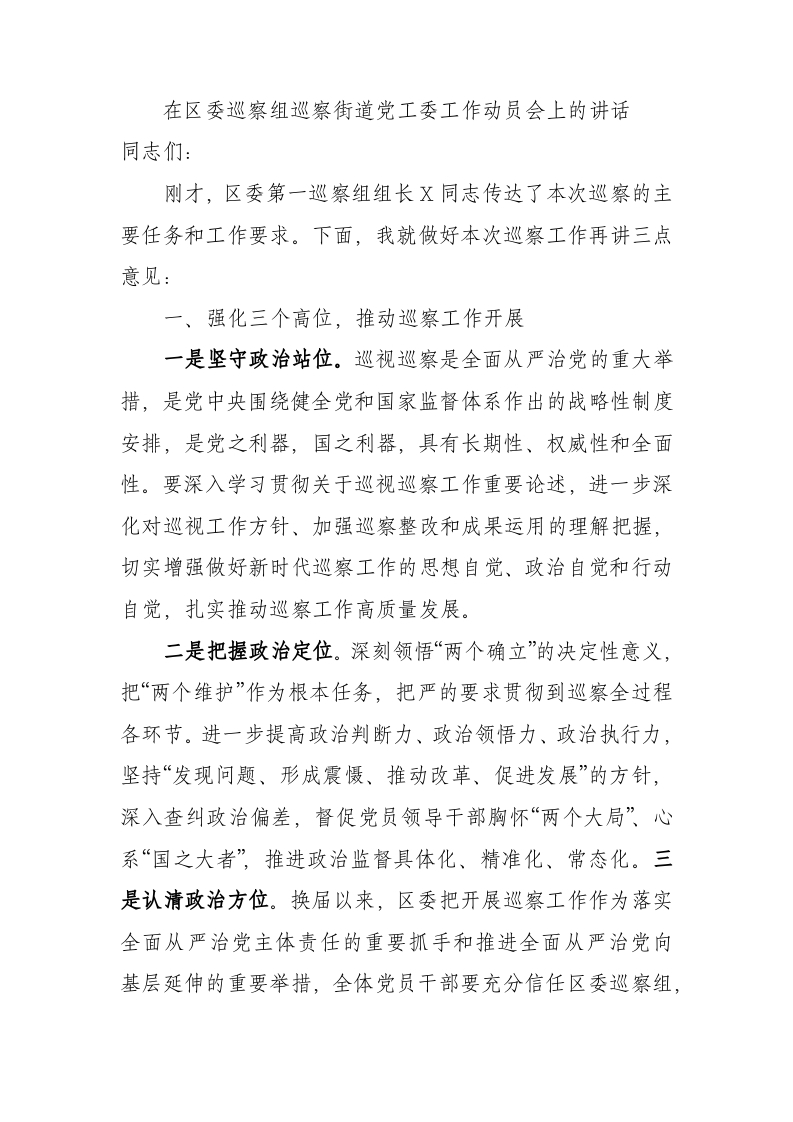 / 在区委巡察组巡察街道党工委工作动员会上的讲话
