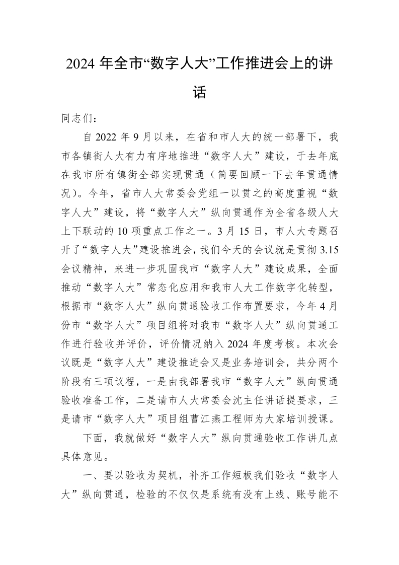/ 2024年全市“数字人大”工作推进会上的讲话
