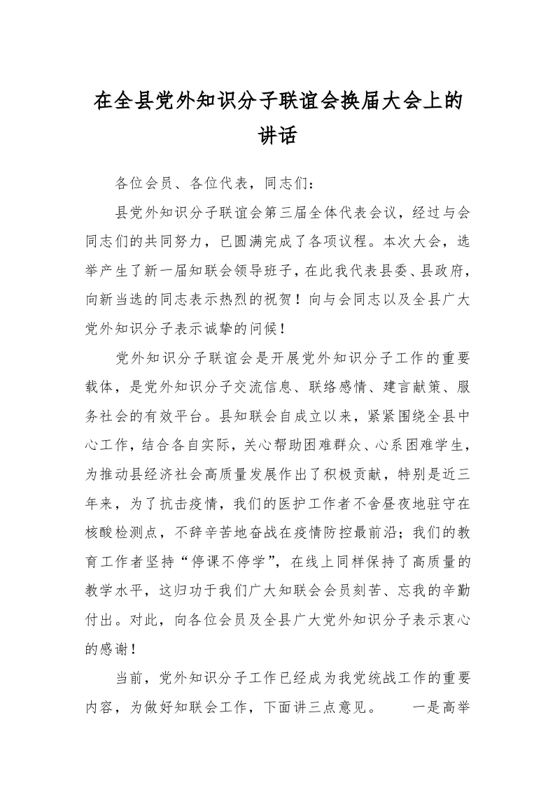 / 在全县党外知识分子联谊会换届大会上的讲话