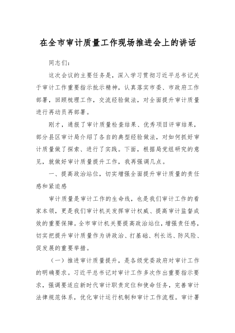 / 在全市审计质量工作现场推进会上的讲话