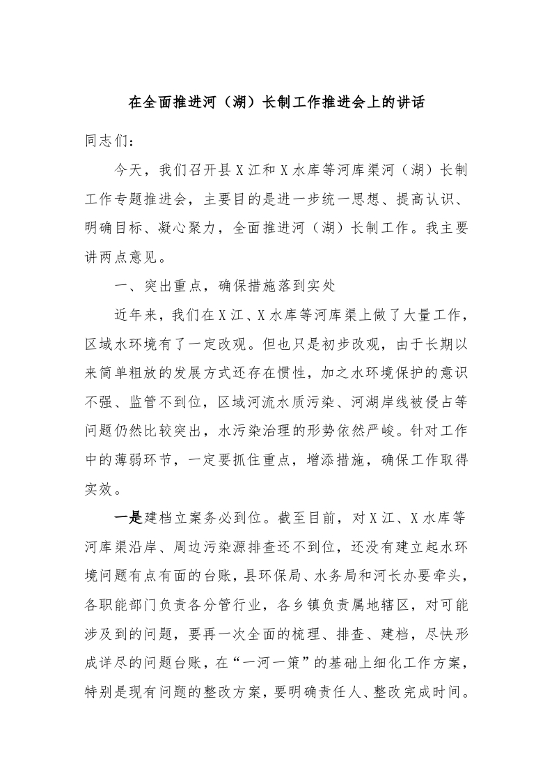 / 在全面推进河(湖)长制工作推进会上的讲话