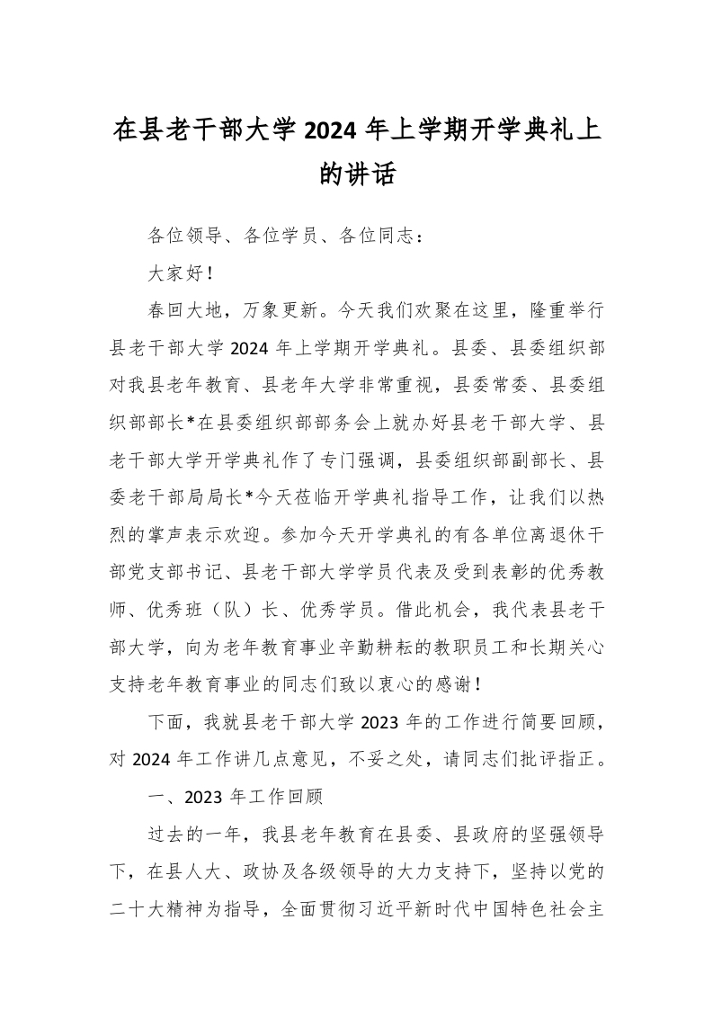 / 在县老干部大学2024年上学期开学典礼上的讲话