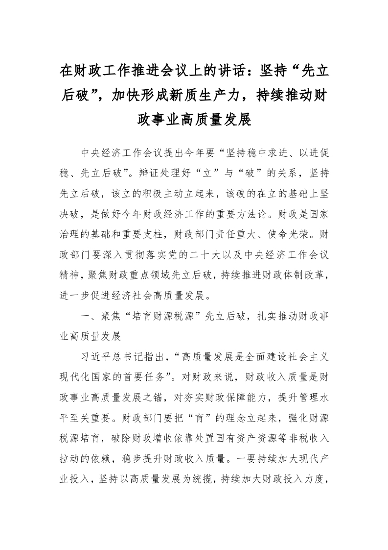 在财政工作推进会议上的讲话:坚持“先立后破”,加快形成新质生产力,持续推动财政事业高质量发展