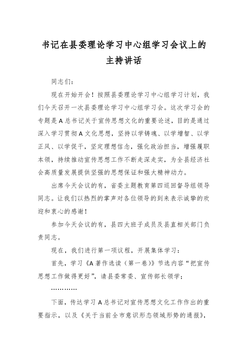 / 书记在县委理论学习中心组学习会议上的主持讲话