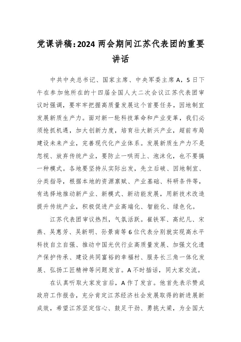 党课讲稿:2024两会期间江苏代表团的重要讲话