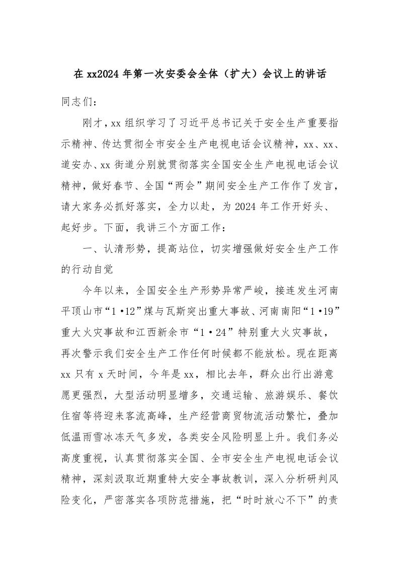 在xx2024年第一次安委会全体(扩大)会议上的讲话