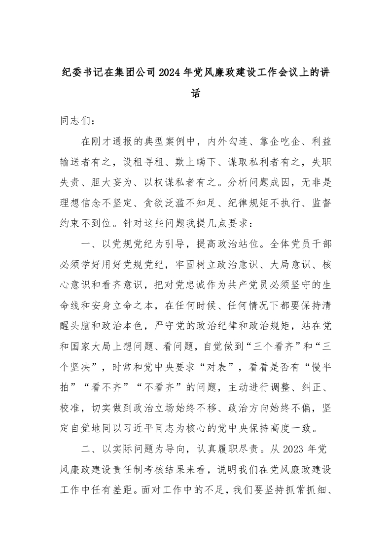 / 纪委书记在集团公司2024年党风廉政建设工作会议上的讲话