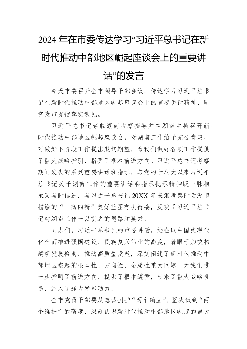 / 2024年在市委传达学习“习近平总书记在新时代推动中部地区崛起座谈会上的重要讲话”的发言