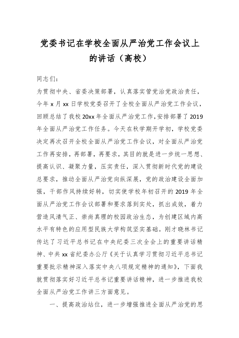 / 党委书记在学校全面从严治党工作会议上的讲话_(高校)