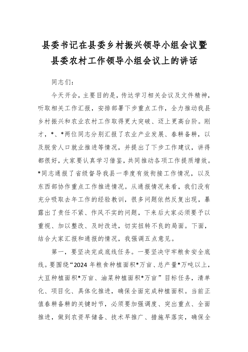 / 县委书记在县委乡村振兴领导小组会议暨县委农村工作领导小组会议上的讲话