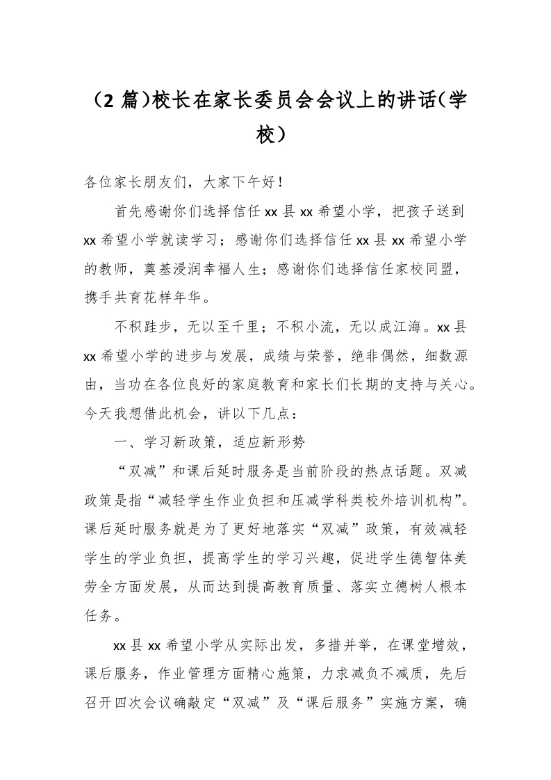 / (2篇)校长在家长委员会会议上的讲话(学校)