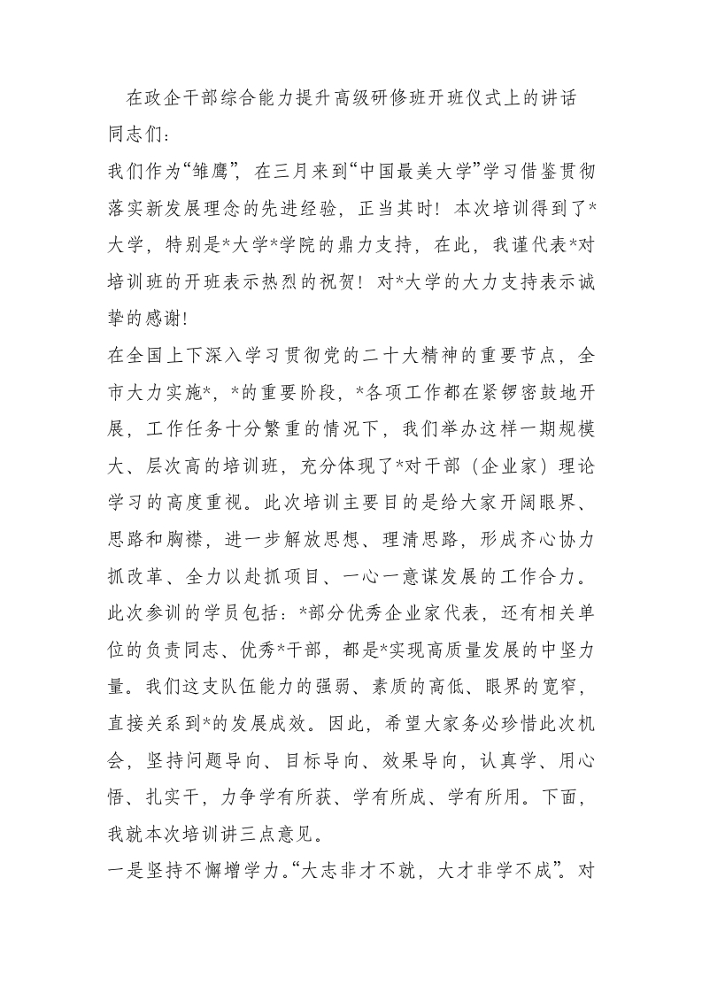 / 在政企干部综合能力提升高级研修班开班仪式上的讲话