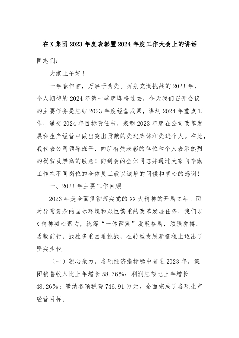 / 在X集团2023年度表彰暨2024年度工作大会上的讲话