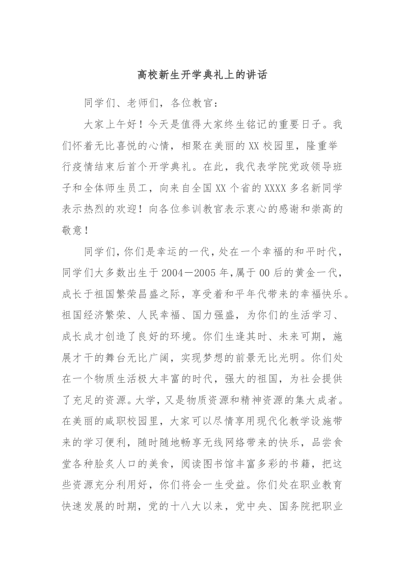 高校新生开学典礼上的讲话