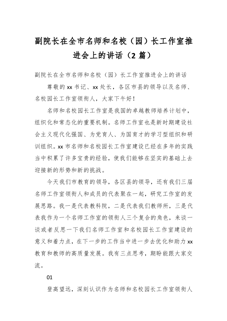 / (2篇)副院长在全市名师和名校(园)长工作室推进会上的讲话