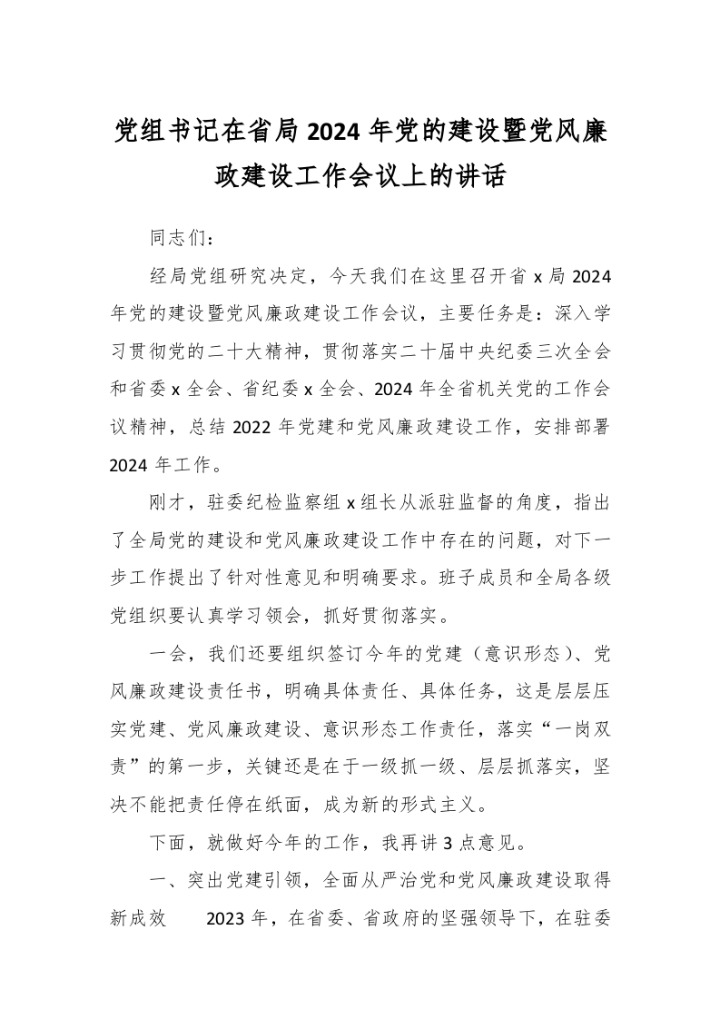 / 党组书记在省局2024年党的建设暨党风廉政建设工作会议上的讲话