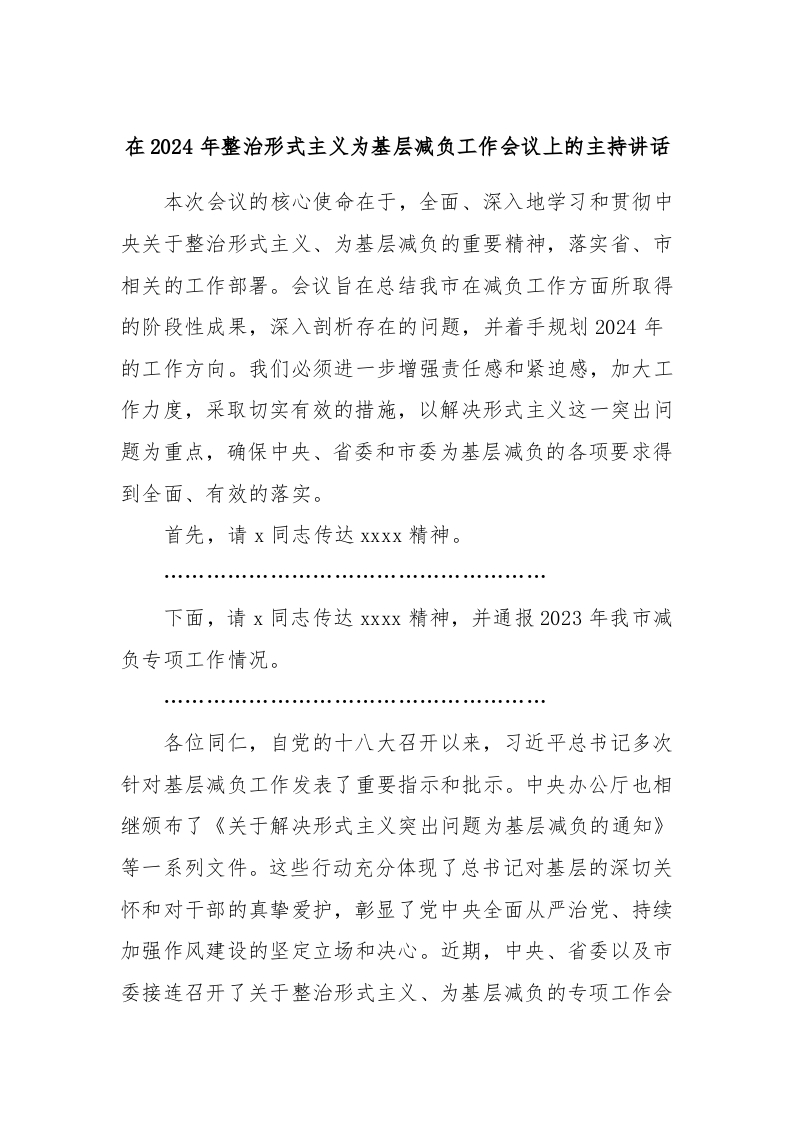 / 在2024年整治形式主义为基层减负工作会议上的主持讲话