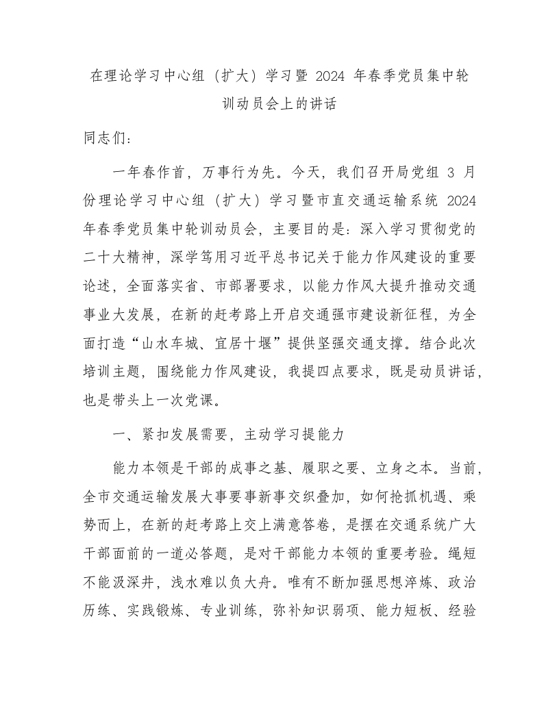 / 在中心组学习暨2024年春季党员集中轮训动员会上的讲话(交通)