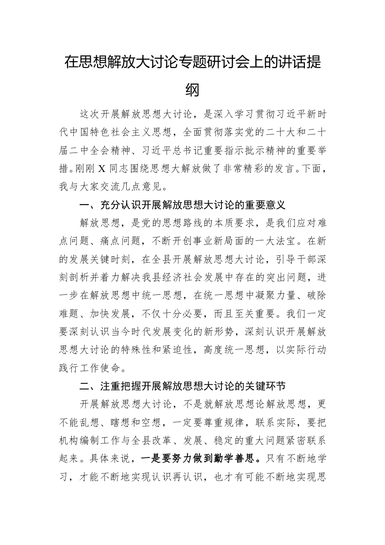 / 在思想解放大讨论专题研讨会上的讲话提纲