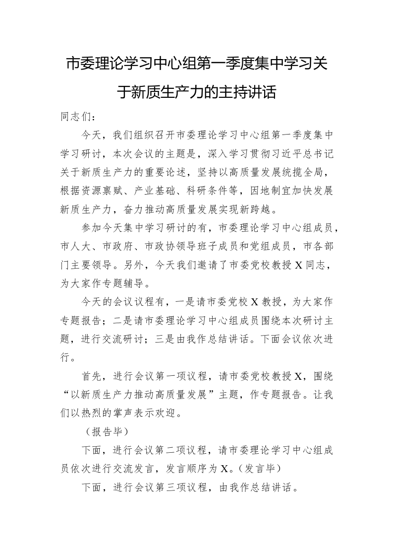 / 市委理论学习中心组第一季度集中学习关于新质生产力的主持讲话