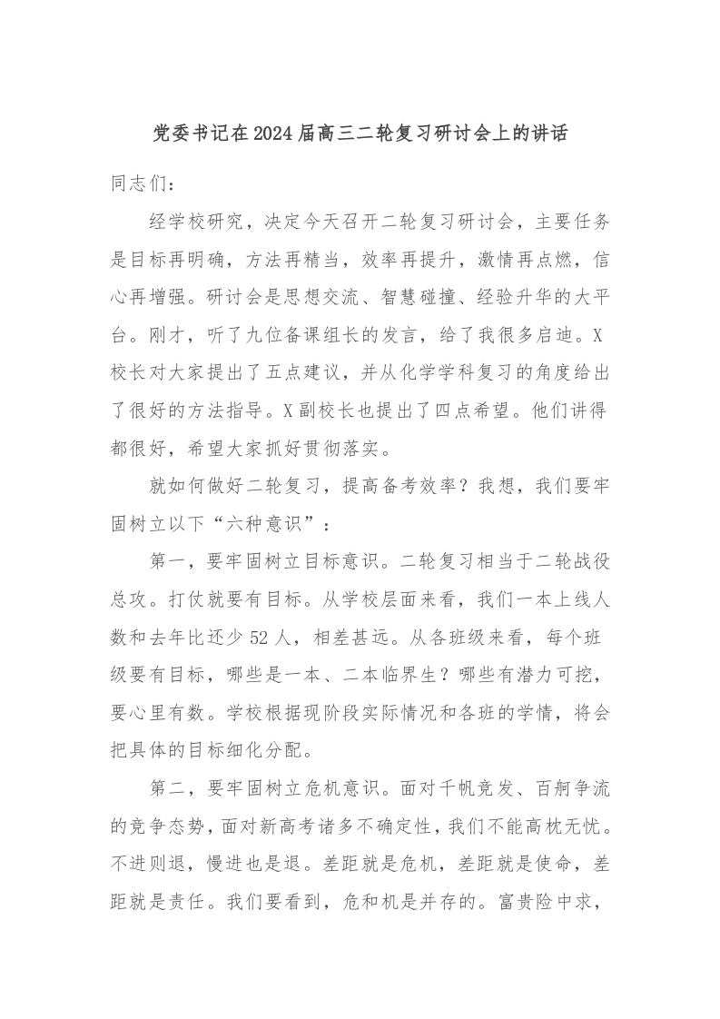/ 党委书记在2024届高三二轮复习研讨会上的讲话