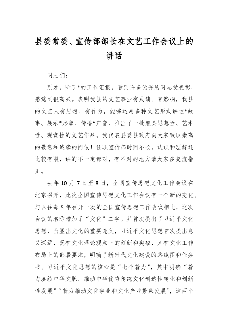 / 县委常委、宣传部部长在文艺工作会议上的讲话