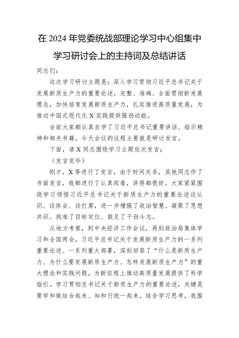 / 在2024年党委统战部理论学习中心组集中学习研讨会上的主持词及总结讲话