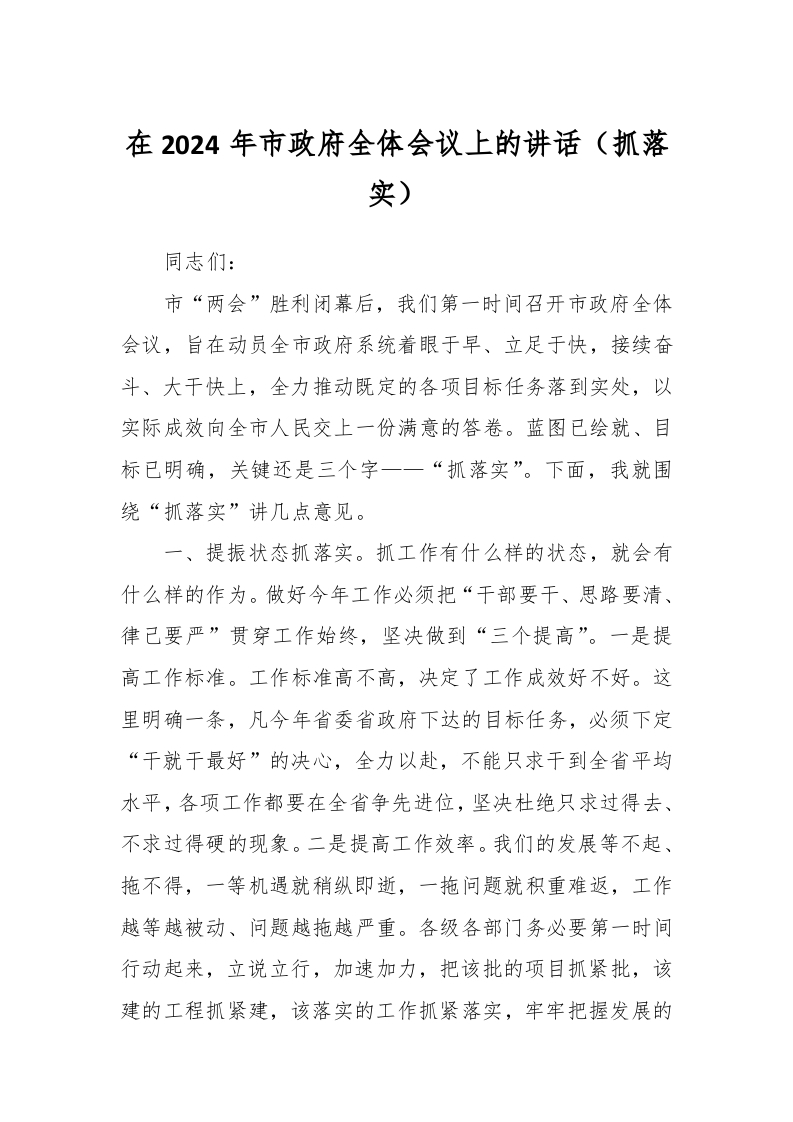 / 在2024年市政府全体会议上的讲话(抓落实)