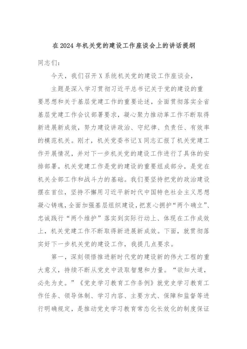 / 在2024年机关党的建设工作座谈会上的讲话提纲