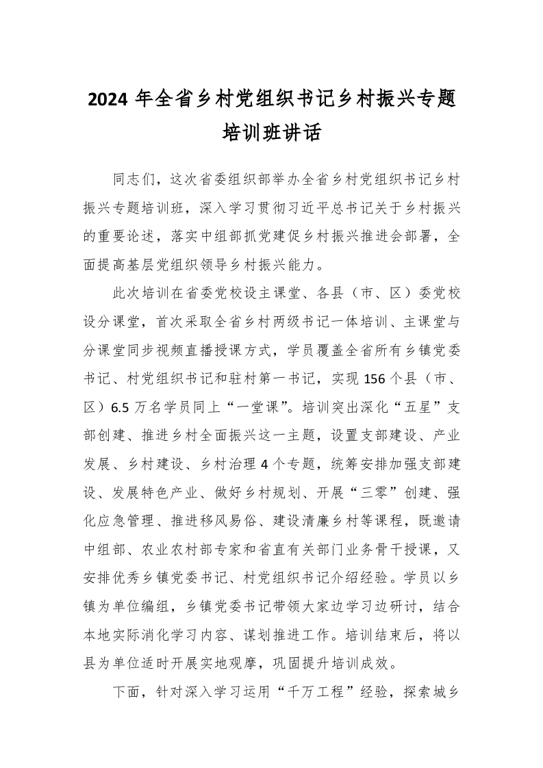 / 2024年全省乡村党组织书记乡村振兴专题培训班讲话