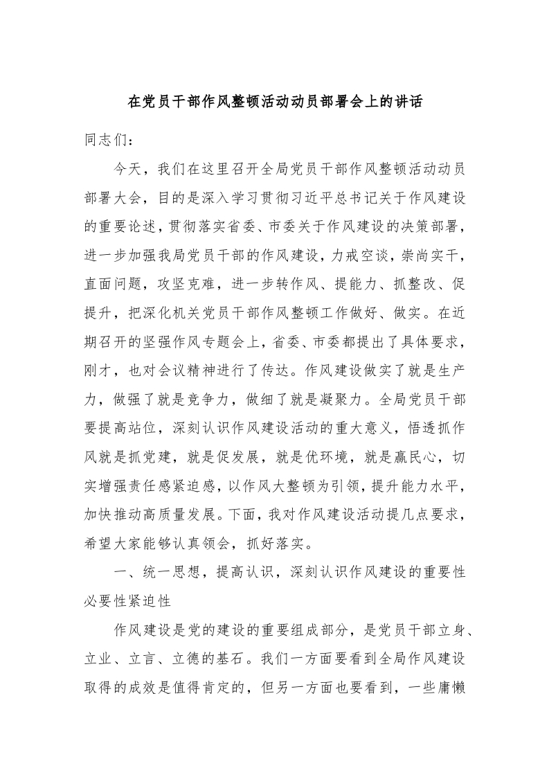 / 在党员干部作风整顿活动动员部署会上的讲话