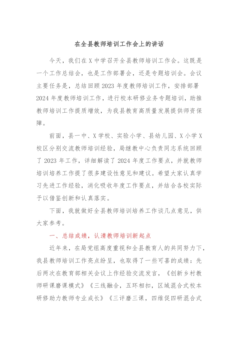 / 在全县教师培训工作会上的讲话