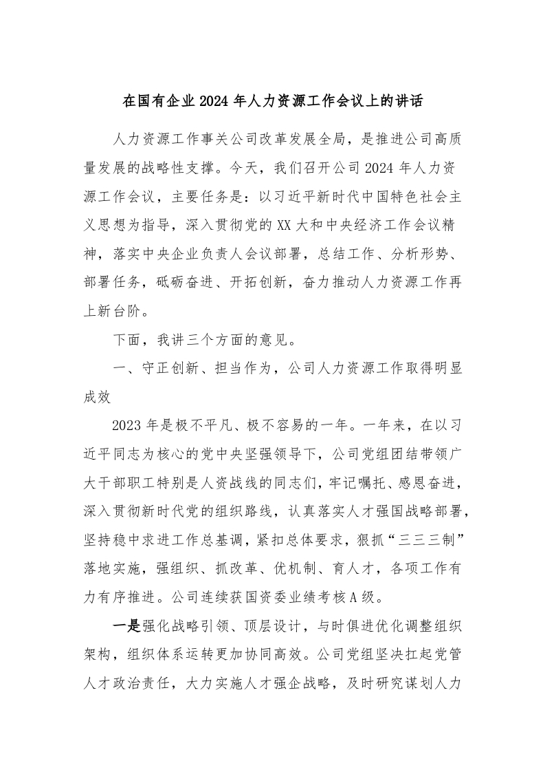 / 在国有企业2024年人力资源工作会议上的讲话
